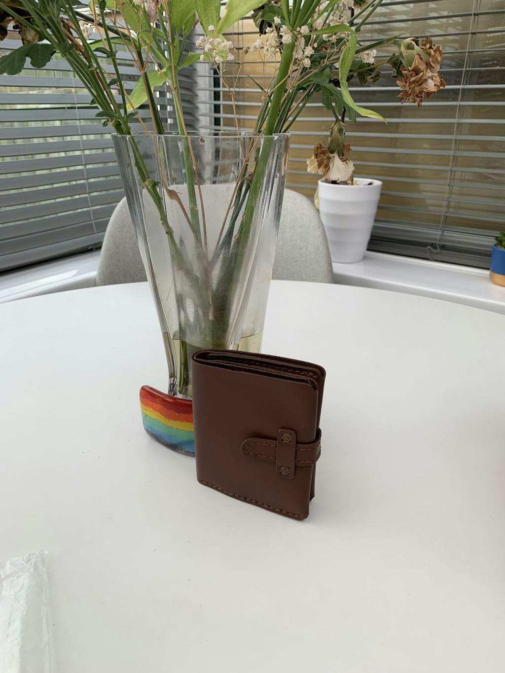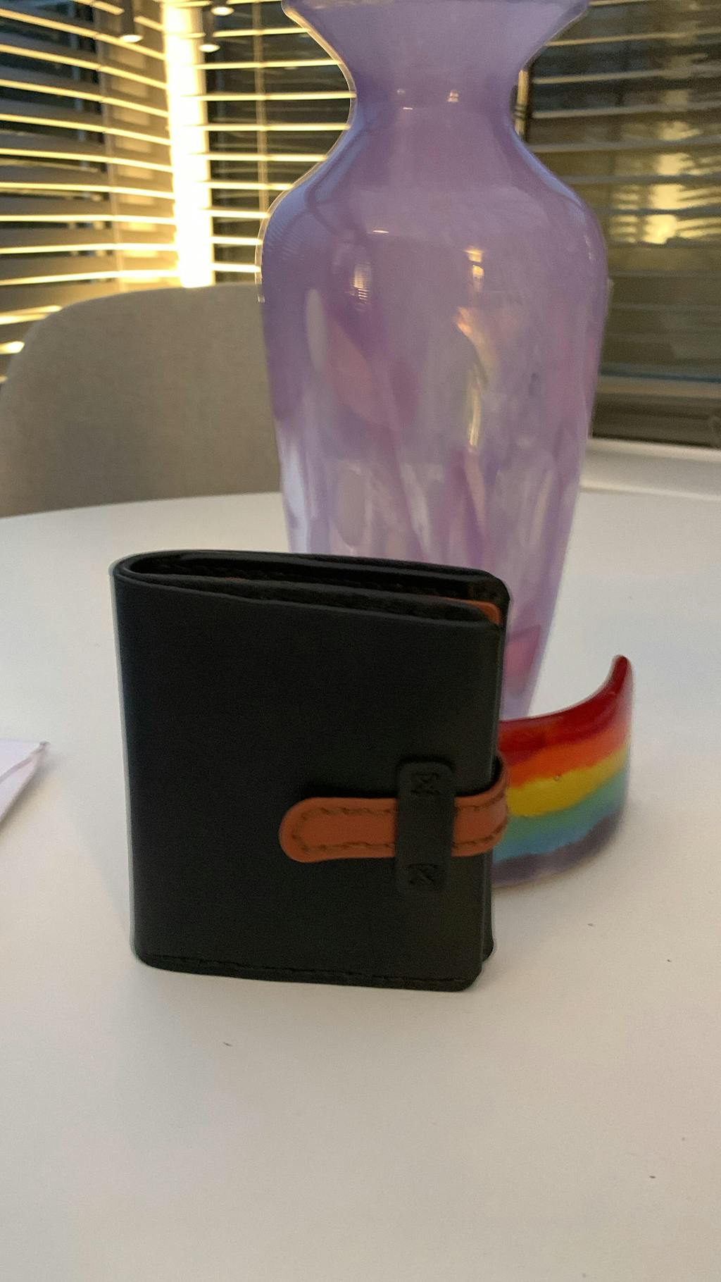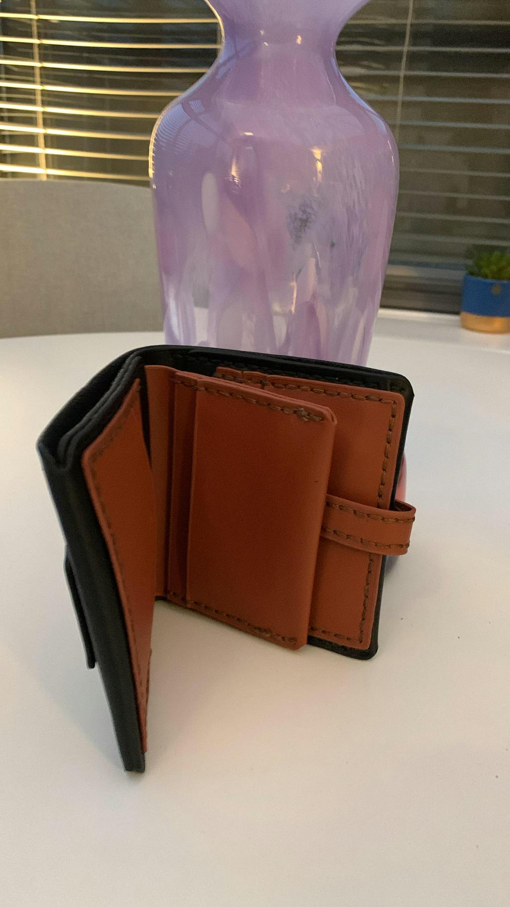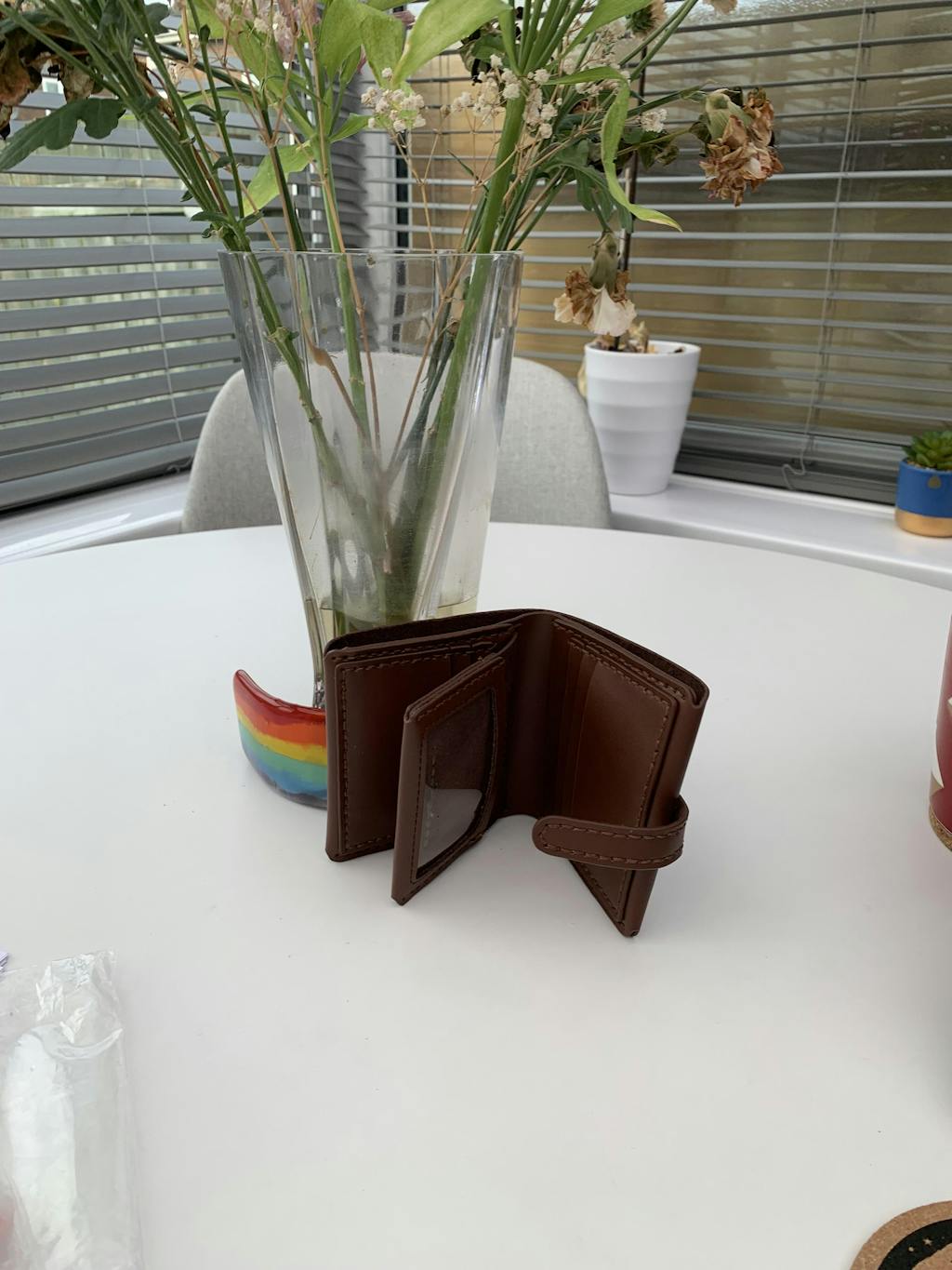The REAL LEATHER wallet is dark brown colour (the other photos are for scale and illustration).